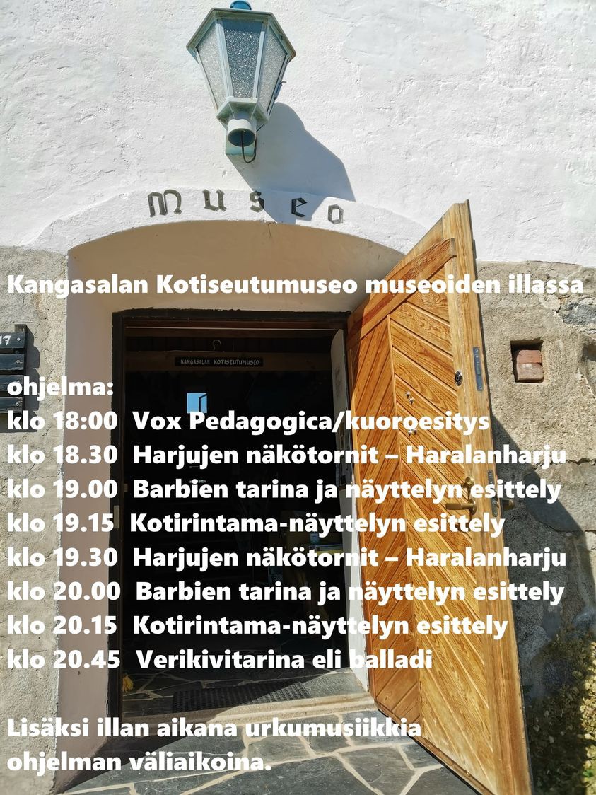 Kangasalan museokohteissa avoimet ovet, musiikkiesityksiä, opastuksia ja paljon muuta ohjelmaa. Museoiden ilta: https://www.kangasala.fi/tapahtuma/museoiden-ilta-3/